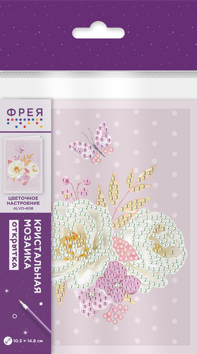 Набор для изготовления открытки в технике " Кристальная/ алмазная мозаика". Выполнение работы не требует специальных навыков, выкладывать картинку очень легко и быстро. Стразы наклеиваются поверх изображения со схемой на уже нанесенный клеевой слой. Увлекательный процесс создания открытки поможет развить мелкую моторику и повысить концентрацию внимания. Готовая работа станет замечательным подарком близкому человеку! В набор ТМ ФРЕЯ " Кристальная мозаика" входит:- основа открытки с клеевым слоем и защитной плёнкой,- стилус с восковой подушечкой,- круглые стразы с запасом более 30%,- картонный лоток,- инструкция. Количество цветов: 4Тип выкладки: частичнаяУровень сложности: 1 из 3Размер готового изделия: 14. 8 х 10. 5 смРазмер упаковки: 11. 3 х 20 смНабор сертифицирован для детского творчества. Сообщить о неточности в описании